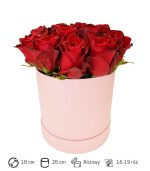 Zamawiając ten flower box otrzymasz kompozycję w pudełku o średnicy 18 cm z 16-19 czerwonymi różami. Liczba zależna od użytych do przygotowania kwiatów.