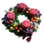 Wianek Adwentowy o średnicy 40 cm, zdobią klasyczne, czerwone świeczki, które stanowią serce tego świątecznego dekoru. Urok dodają mu kwiaty hortensji i jagody hipericum, a całość otoczona jest świeżymi gałązkami jodły. Złote i czerwone ozdoby wraz z eleganckimi wstążkami nadają wiankowi wyjątkowego blasku, czyniąc go idealnym dla każdego domu w okresie adwentu.